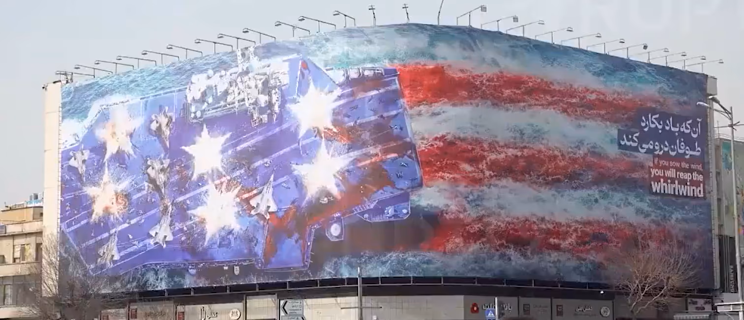 Autoridades iranianas instalaram um outdoor em uma praça central de Teerã mostrando com a imagem de um porta-aviões americano destruído.