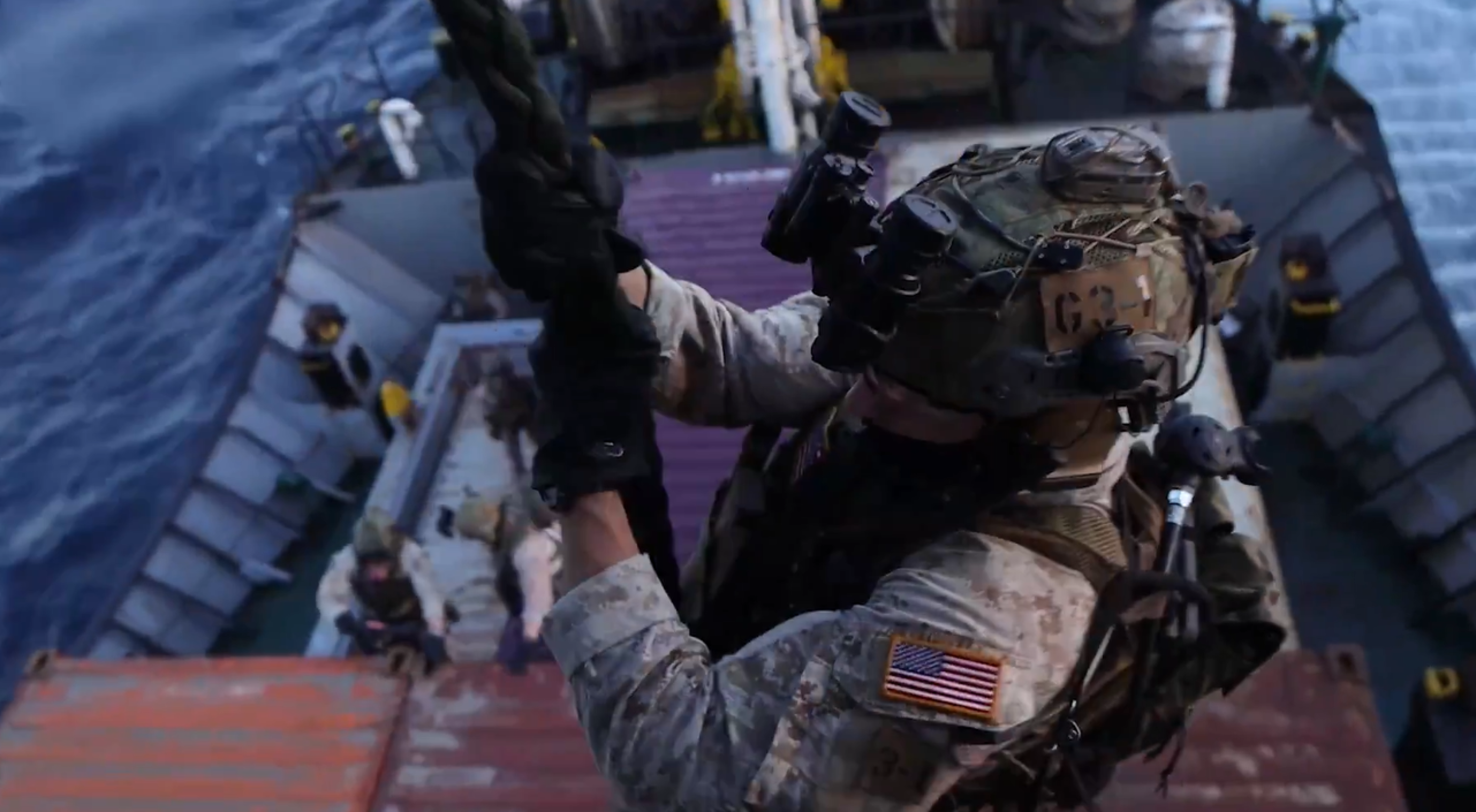 A publicação também incluiu um vídeo que mostra um helicóptero sobrevoando o navio enquanto militares descem de rapel até os contêineres empilhados no convés.