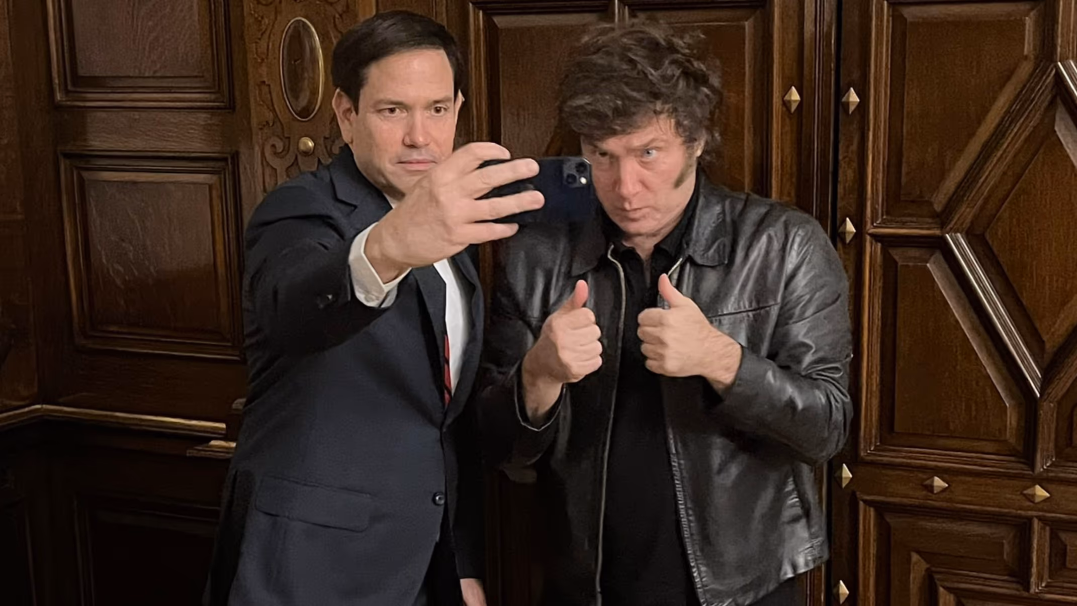 O presidente da Argentina, Javier Milei (à direita na foto, ao lado do secretário de Estado americano, Marco Rubio), compartilhou um vídeo neste sábado, 3, em que liga o ditador venezuelano Nicolás Maduro, capturado por forças americanas, a Lula.