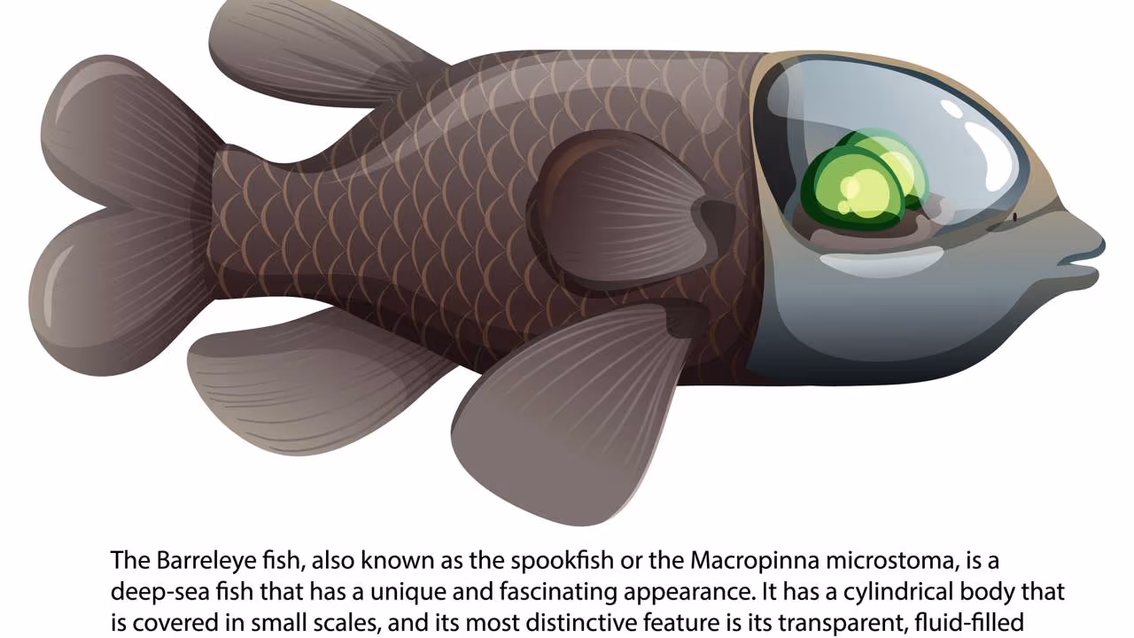 O Macropinna microstoma possui uma cabeça transparente formada por uma estrutura gelatinosa que protege os olhos tubulares, mantidos em uma câmara preenchida por líquido.