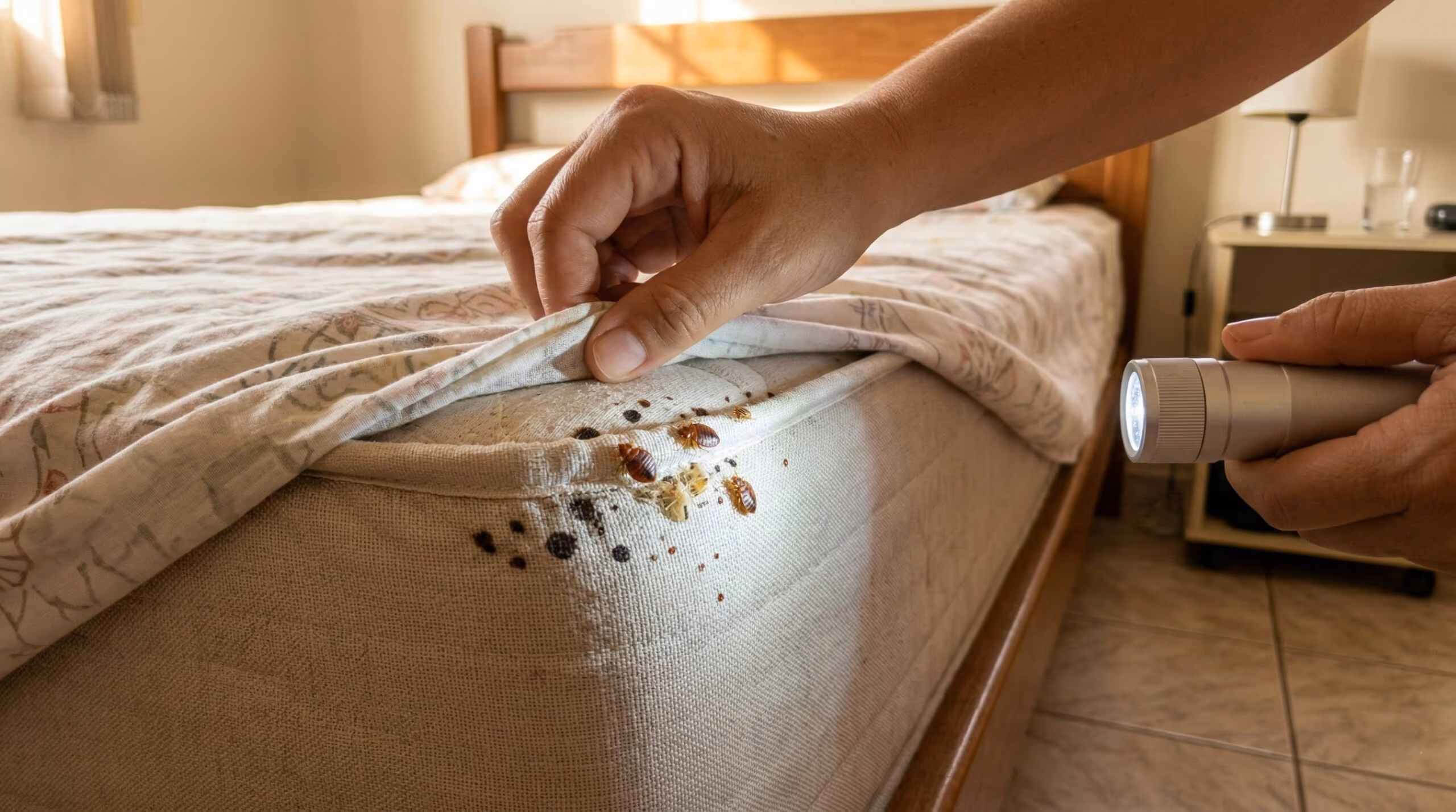 Alguns indícios ajudam a suspeitar da presença desses insetos e devem ser observados com atenção durante a inspeção do quarto e de móveis estofados: