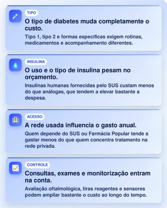 No SUS, pessoas com diabetes tipo 2 que usam medicamentos orais e insulinas humanas costumam ter gastos diretos próximos de zero até alguns milhares de reais em 10 anos. Já o uso contínuo de insulinas mais caras e tiras reagentes em grande quantidade pode levar o total além de R$ 30 mil no mesmo período.